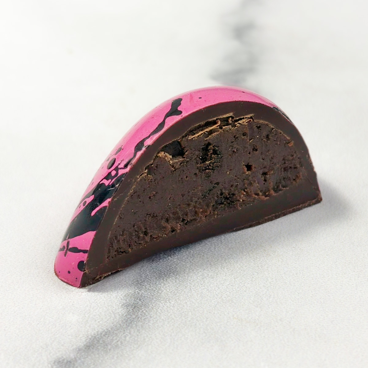 A speckled teardrop dark chocolate shell with a fudgy brownie filling.