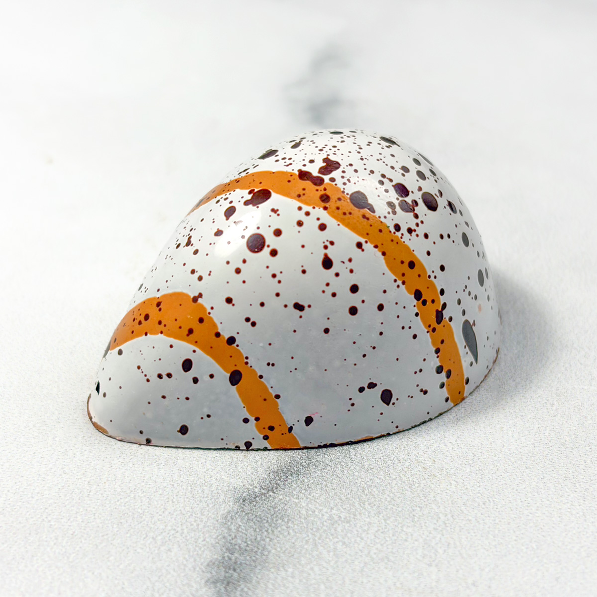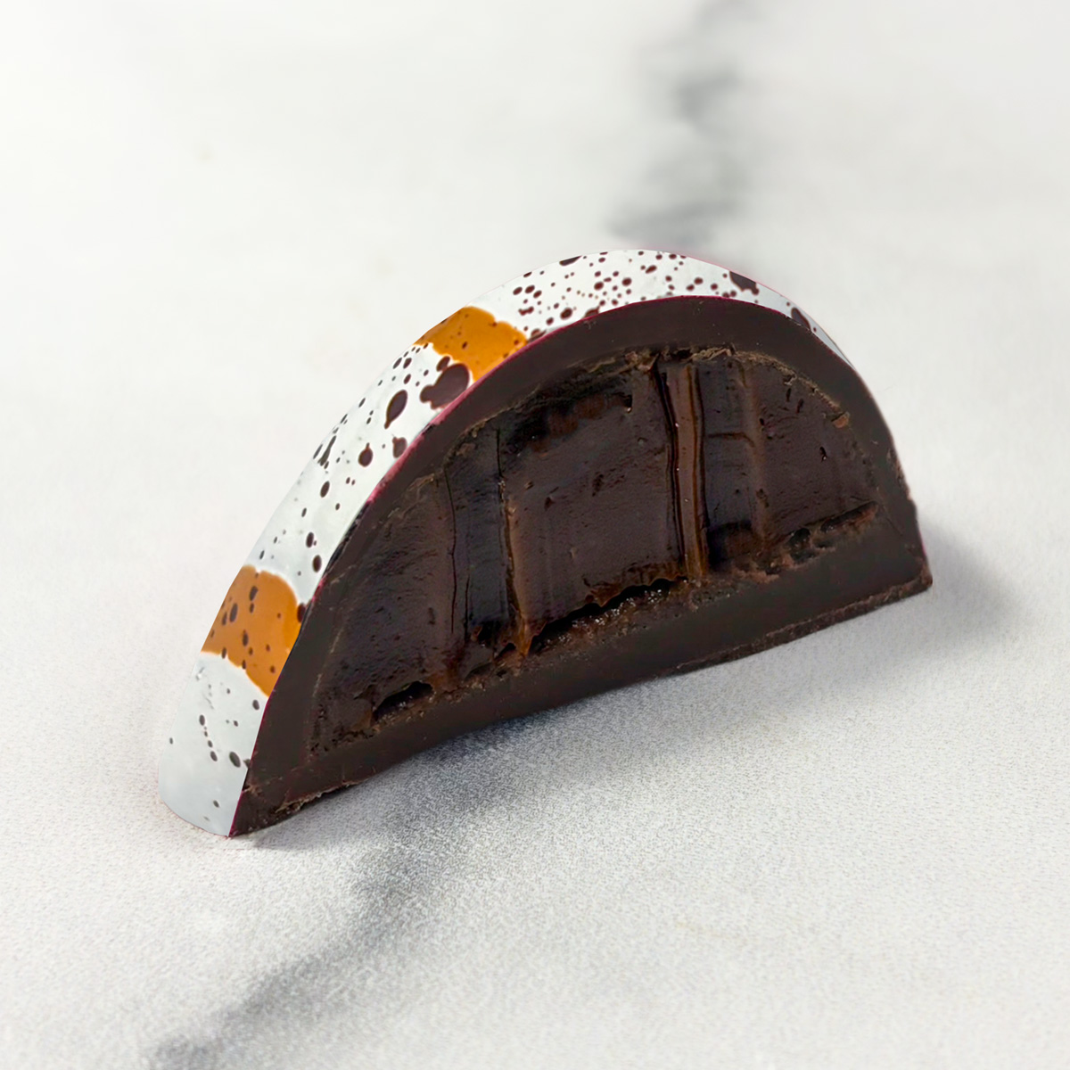 A teardrop-shaped dark chocolate shell filled with creamy hazelnut ganache.