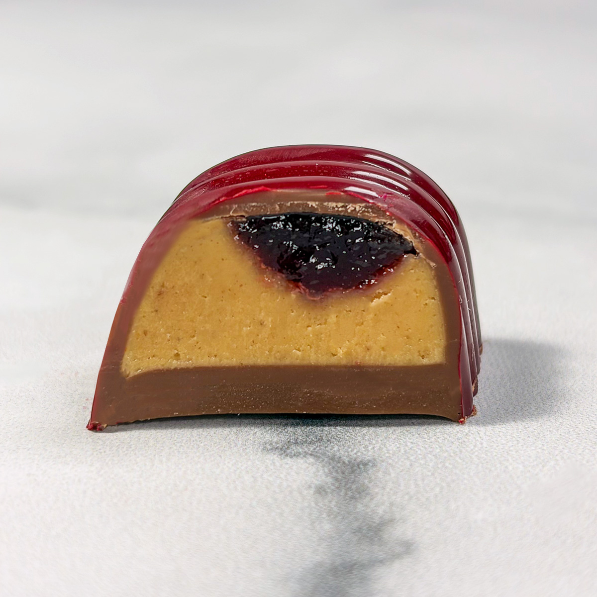 Tart Raspberry Preserves and Creamy Peanut Butter in a Milk Chocolate Shell