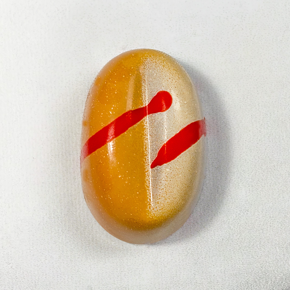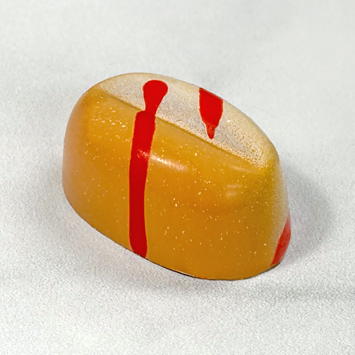 A brightly decorated dark chocolate shell filled with a pumpkin spice latte ganache.